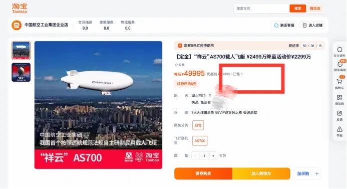 本屆航展開幕前,中國航空工業集團自主研制的“祥云”AS700載人飛艇價格直降200萬元,在淘寶上架,并收獲湖北荊門城控集團旗下文旅公司的1架訂單的定金。開幕首日,買賣雙方在航展現場完成訂單簽約。“今年是‘低空經濟發展元年’。國內多家頭部旅游企業紛紛表示出對飛艇旅游的興趣。”荊門城控集團表達了對AS700在“低空+時尚旅游”中廣闊應用前景的期待。