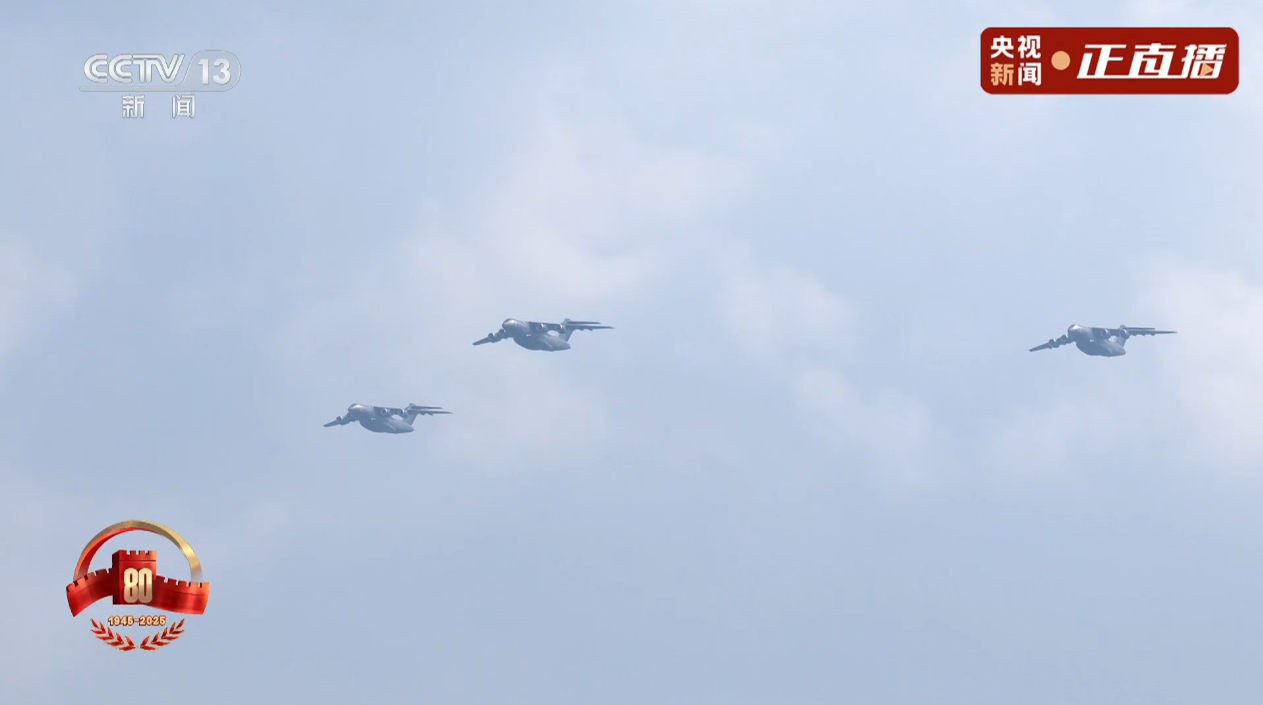 運輸機梯隊來了,運20A、運20B編成兩個楔隊,以戰(zhàn)斗姿態(tài)編組飛過天安門廣場。
