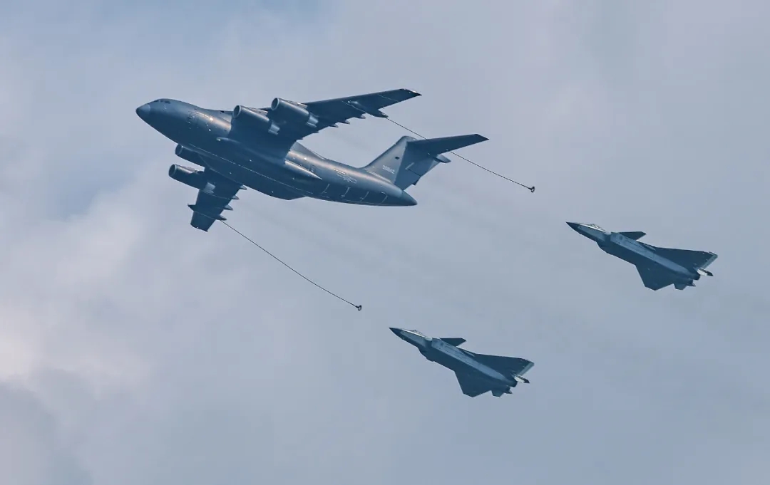 加受油機梯隊由三架運油20A演示為轟6N、殲16、殲20加油。運油20A飛機是我國新一代空中加油裝備,支撐中國戰機奮飛遠航。