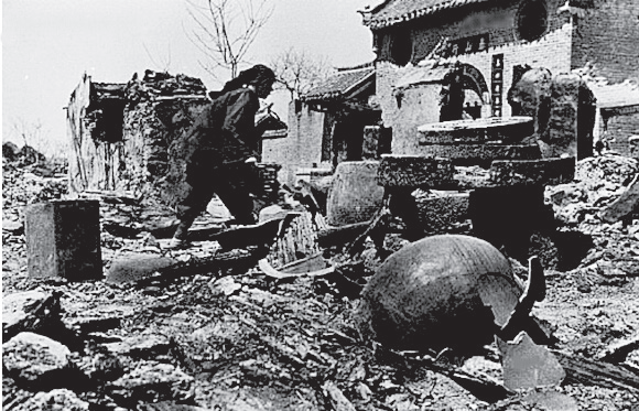 “二四”大轟炸后的貴陽市民和街區(qū)慘狀。