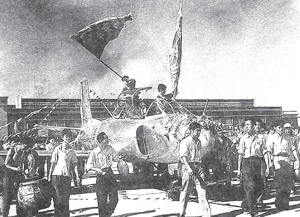 總裝下線后,職工們護(hù)送第一架殲教1飛機(jī)去試飛車間。