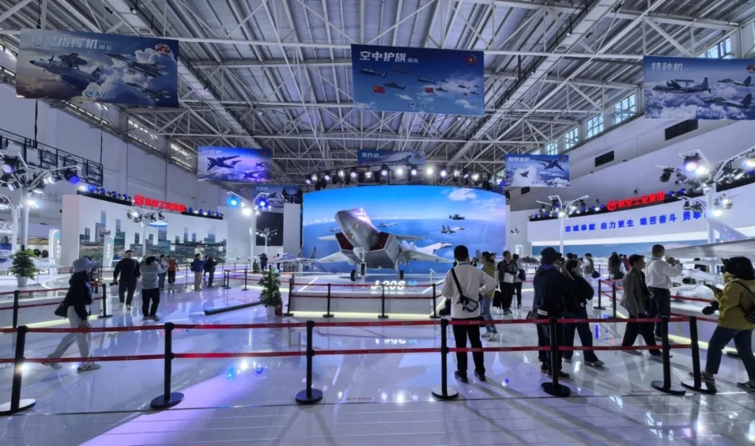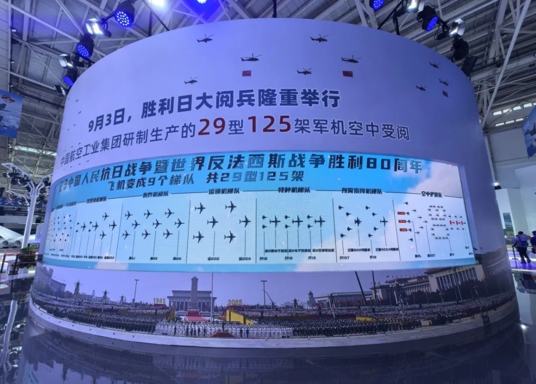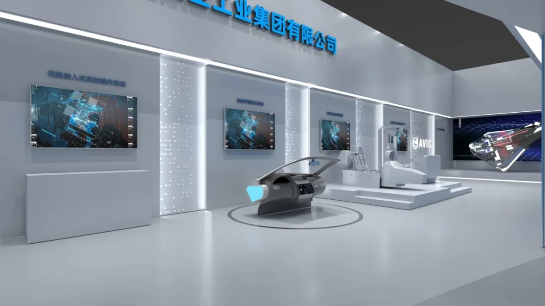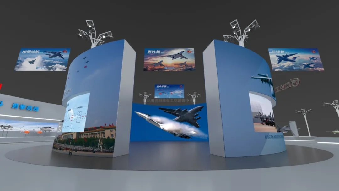 集中展示中國航空工業集團主力明星機型,大屏幕循環播放九三閱兵空中編隊視頻,配合展區中央的360度沉浸式觀影空間,營造氣勢磅礴的形象展區。