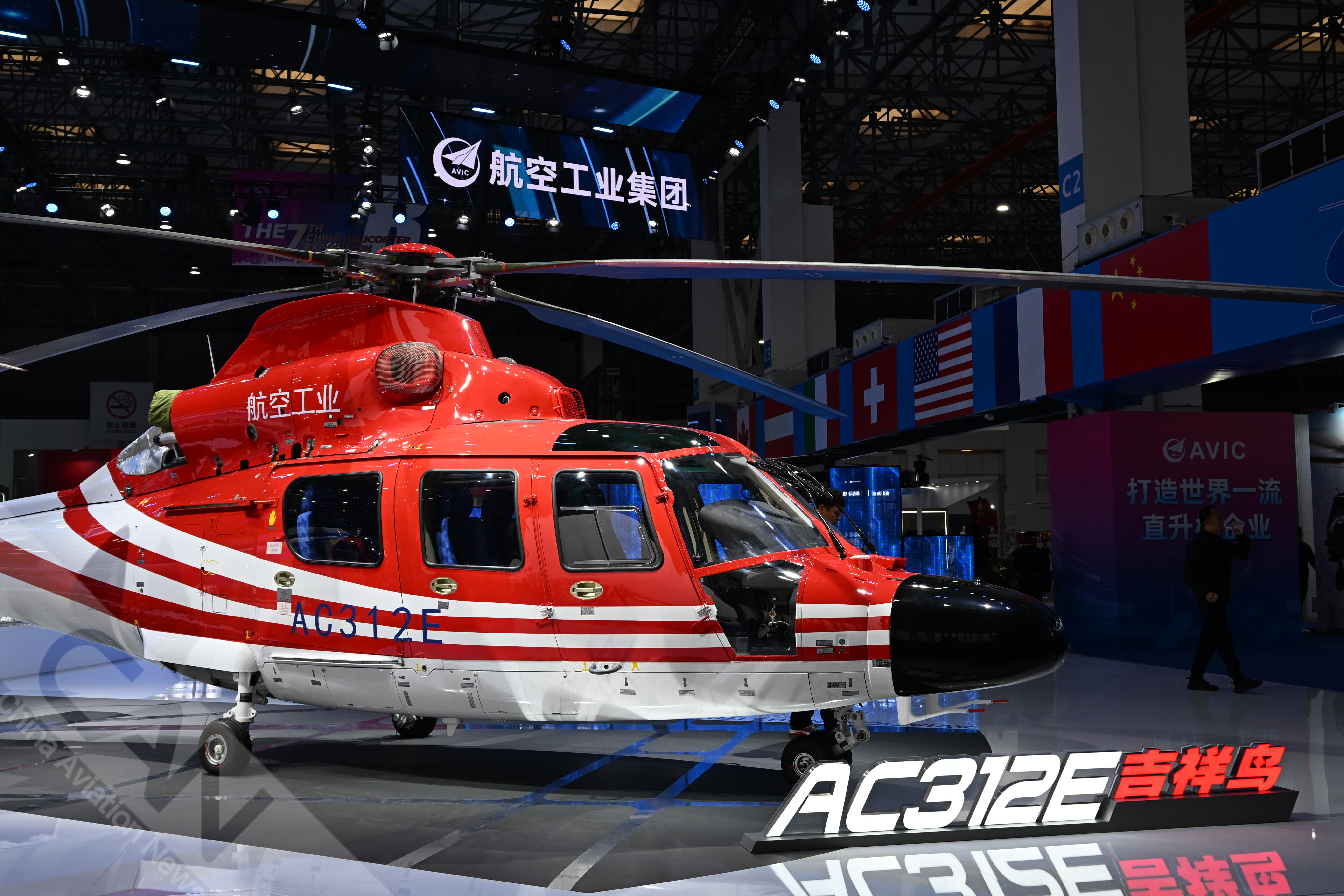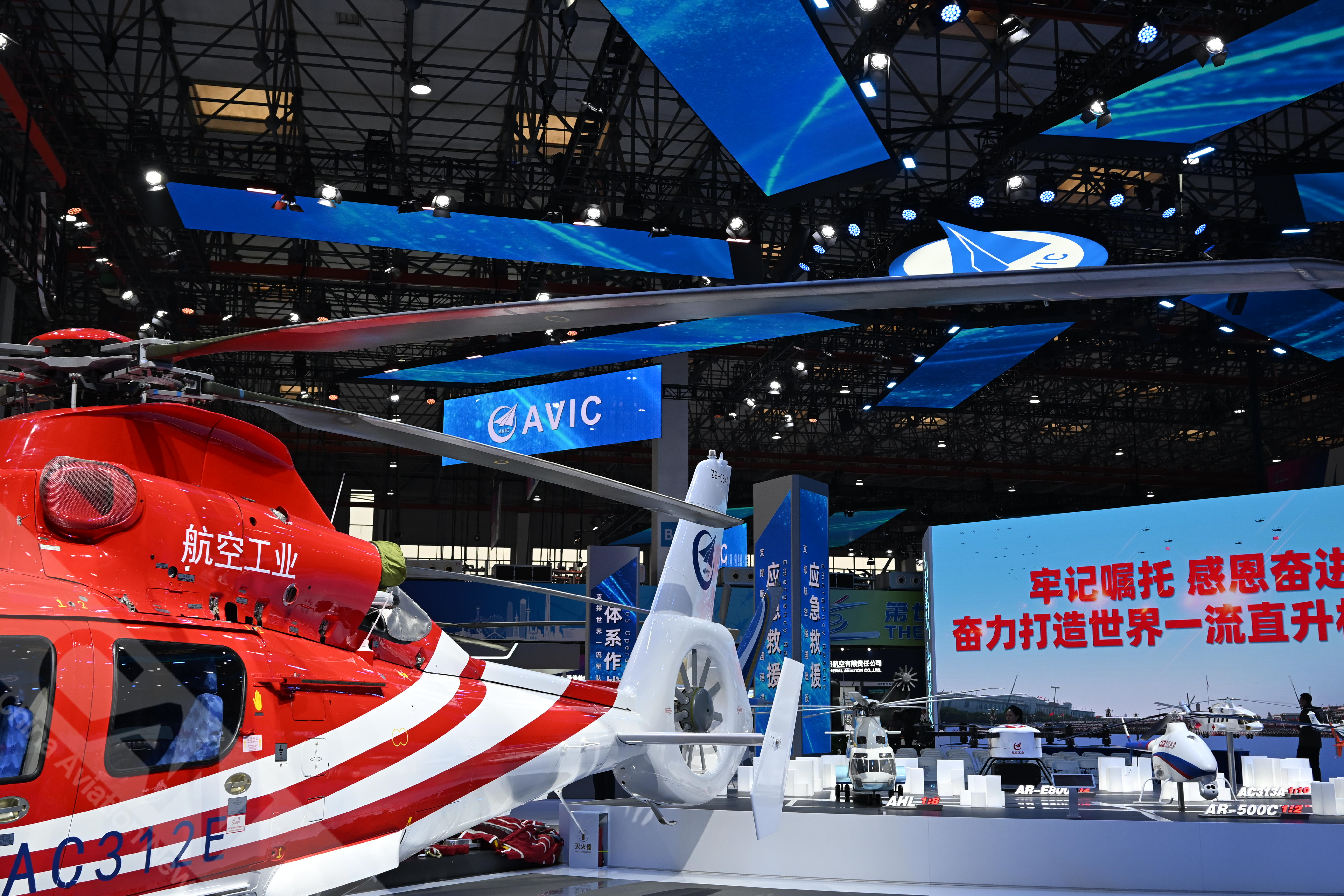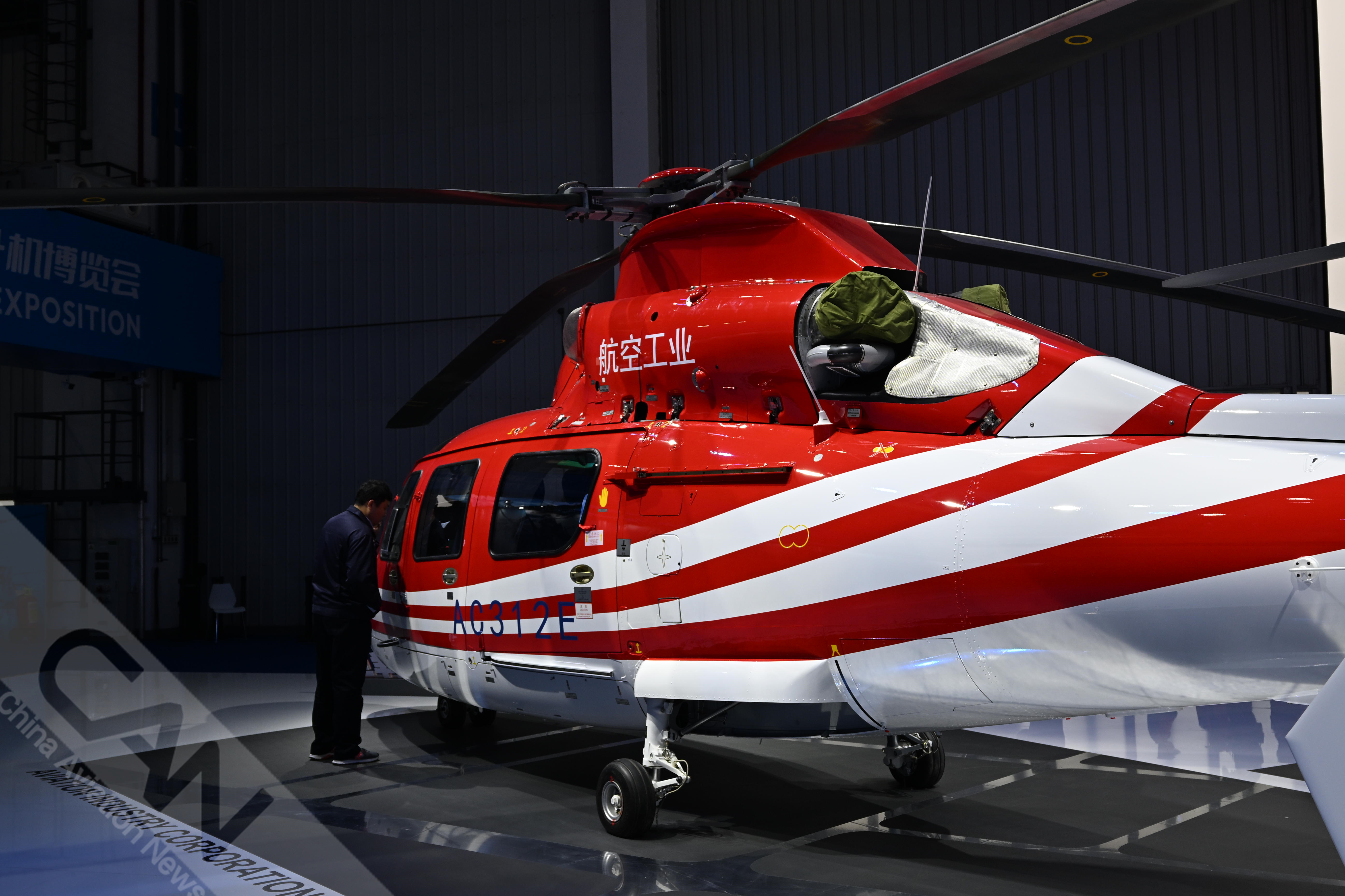AC312E亮相第七屆天津直博會(huì)室內(nèi)展館。AC312E是航空工業(yè)集團(tuán)響應(yīng)國(guó)家通航產(chǎn)業(yè)發(fā)展研制的雙發(fā)多用途直升機(jī)。攝影:吳紫磨