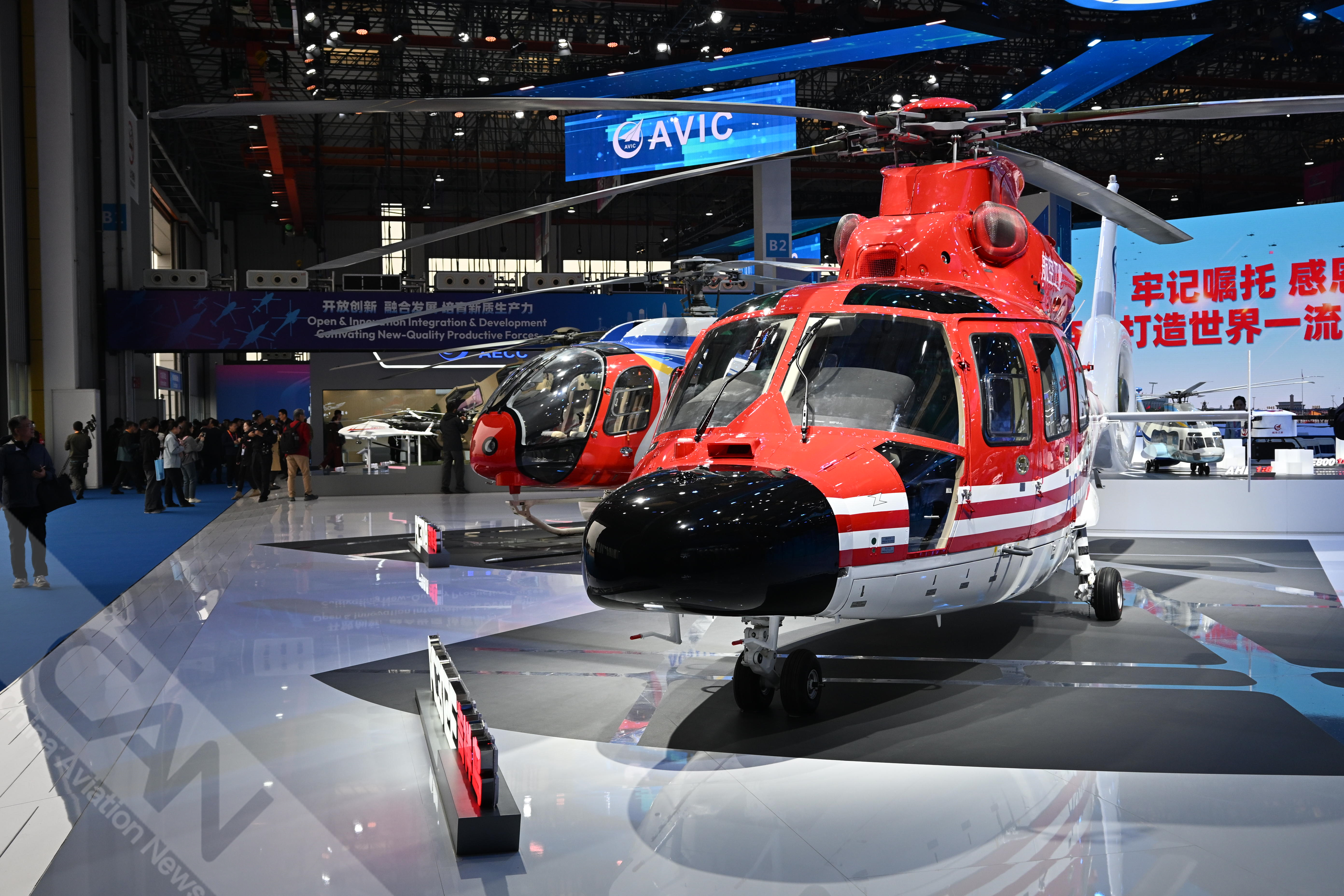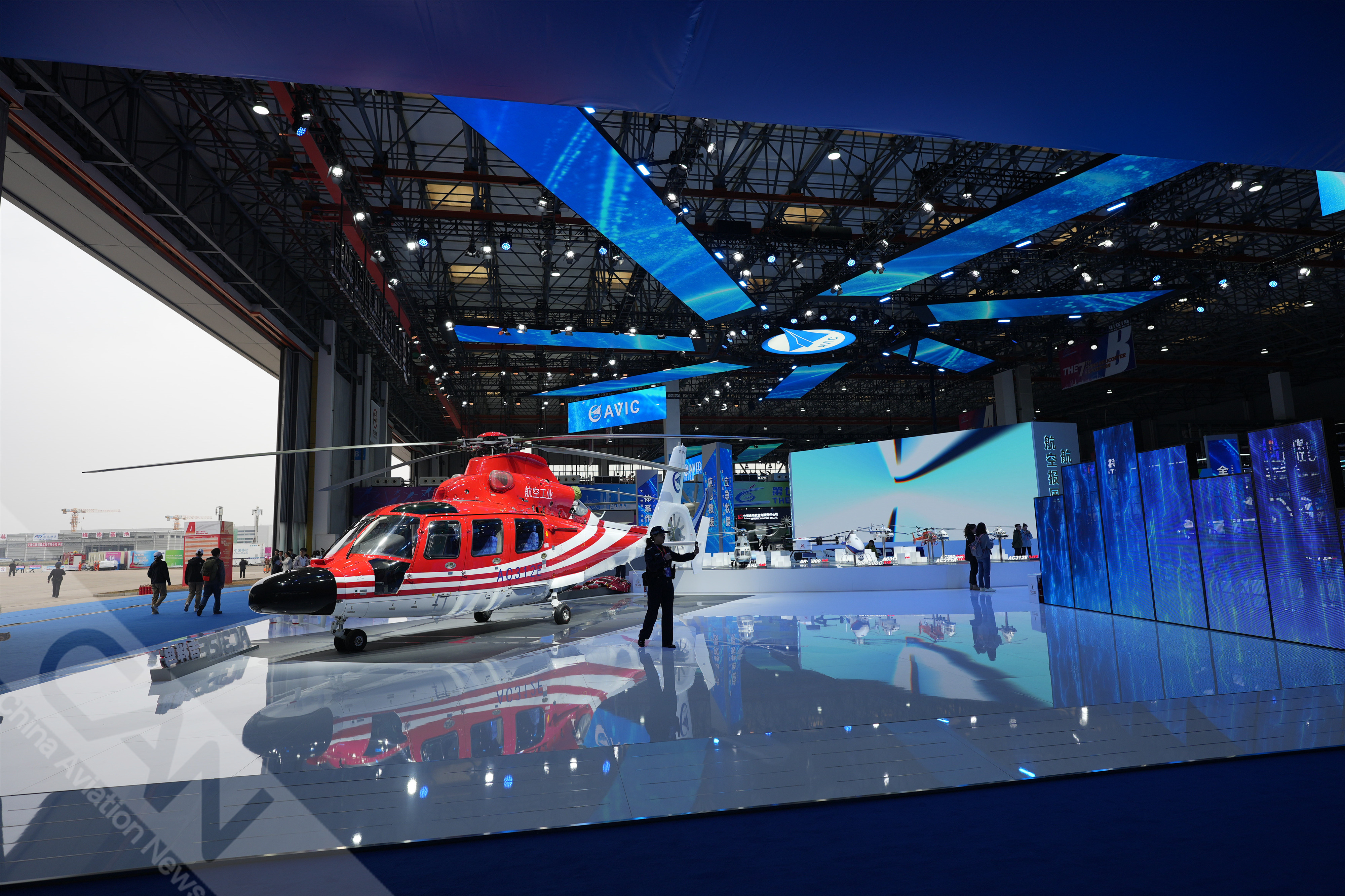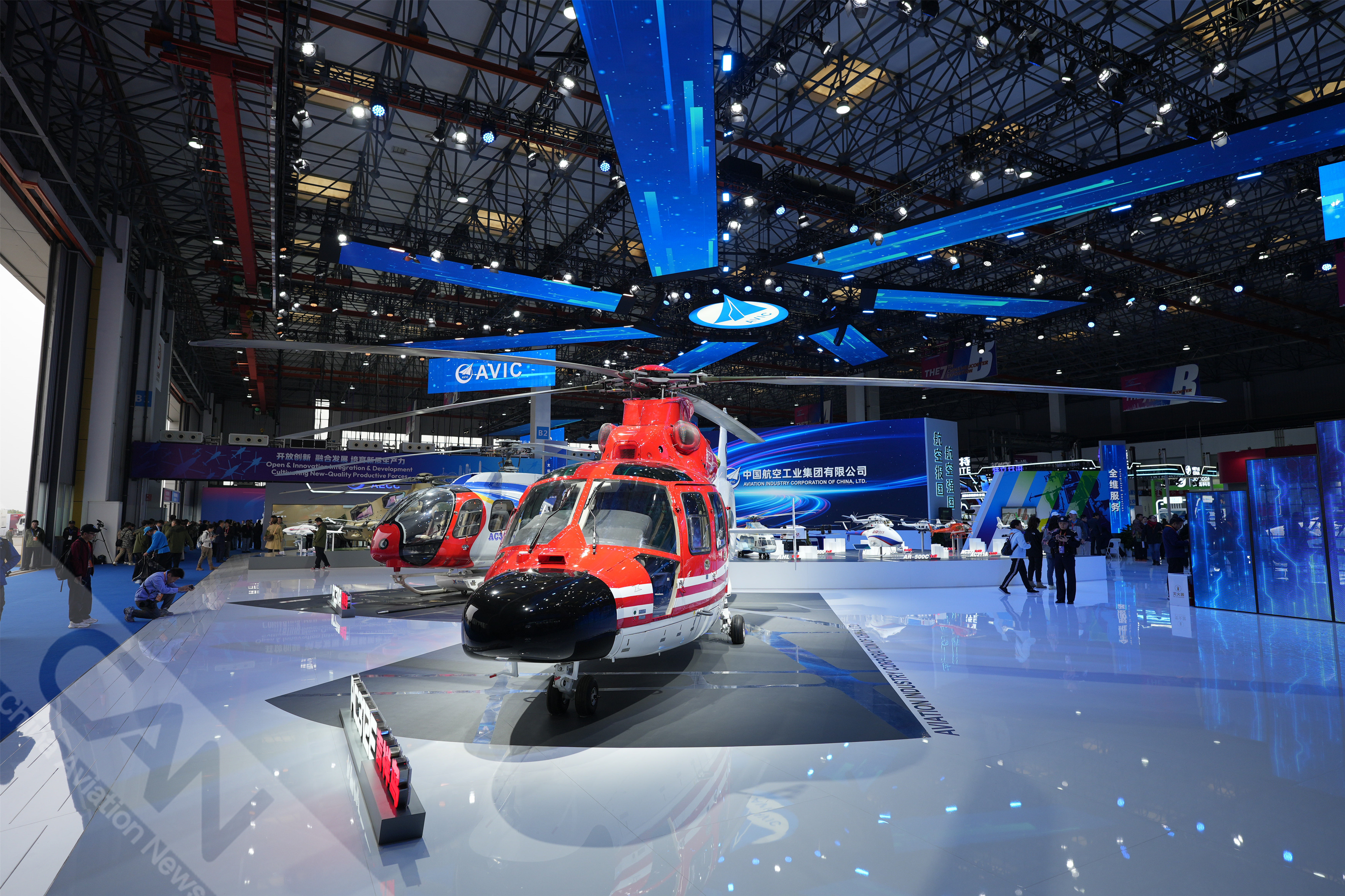 AC312E亮相第七屆天津直博會(huì)室內(nèi)展館。AC312E是航空工業(yè)集團(tuán)響應(yīng)國(guó)家通航產(chǎn)業(yè)發(fā)展研制的雙發(fā)多用途直升機(jī)。攝影:吳紫磨