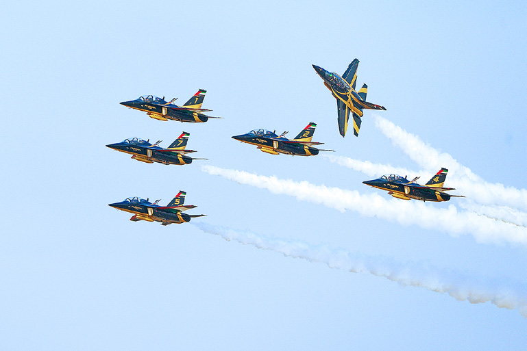 換裝L15后的阿聯酋空軍“騎士”飛行表演隊進行首次飛行表演,高質量完成多個飛行科目。作為我國航空工業有人機裝備在海灣地區的開創性市場突破,L15項目自合同簽署后,國內相關單位按進度完成了科研、生產、交付與培訓,使得“騎士”飛行表演隊在首秀中得以充分展示L15飛機優異的性能和飛行員嫻熟的駕駛技術。