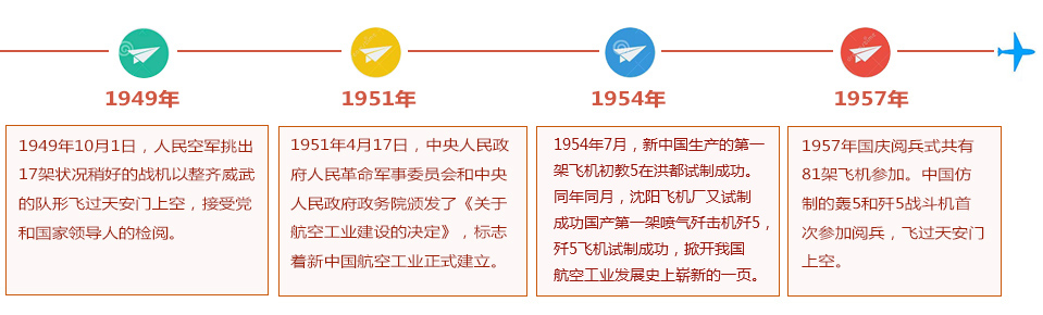 1954年7月,新中國生產(chǎn)的第一架飛機(jī)初教5在洪都試制成功。同年同月,沈陽飛機(jī)廠又試制成功國產(chǎn)第一架噴氣殲擊機(jī)殲5,殲5飛機(jī)試制成功,掀開我國航空工業(yè)發(fā)展史上嶄新的一頁。【詳細(xì)>>】