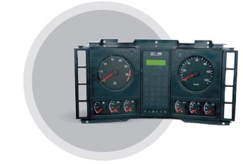 用于上汽依維柯紅巖汽車有限公司商用車,該組合儀表包括一個電子轉速表,一個車速里程表,一個油量表,兩個氣壓表,一個水溫表,一個電壓表,一個符號燈板。分別用于指示相應系統的指示值以及報警警示。